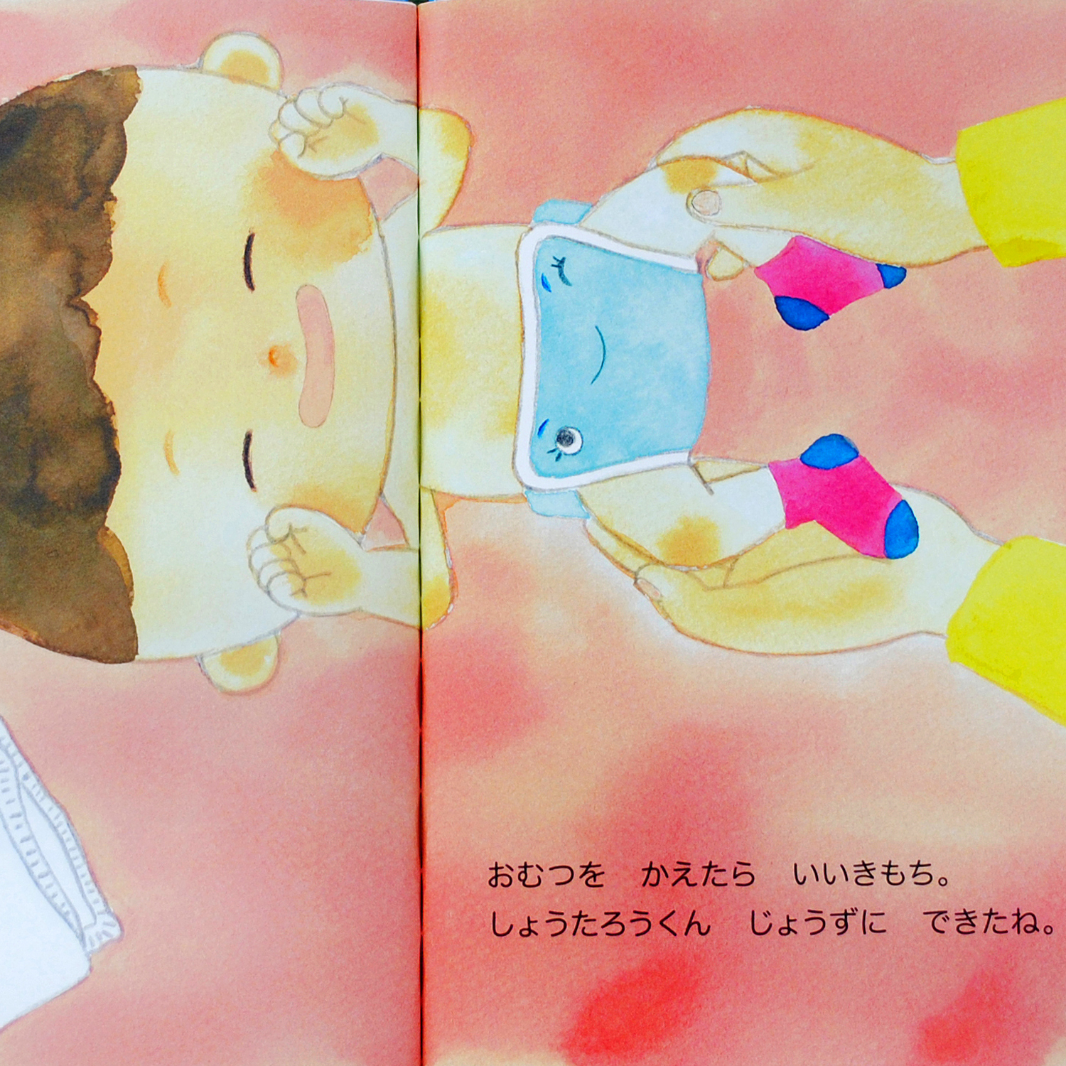 泣いてばかりの小さなあかちゃんだったきみが・・・。 お母さん、お父さん、それから、ほ乳瓶、おむつ、おもちゃたちまで?! やさしいみんなに見守られて笑顔になっていきます。