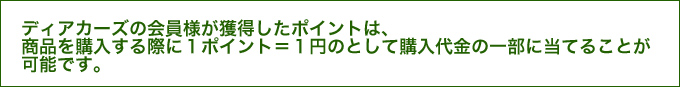 ディアカーズオンラインショッピングでのお買い上げ本体価格(送料と税金、及びポイントでの支払い分は獲得の対象から省きます)の4%をポイントで還元します!